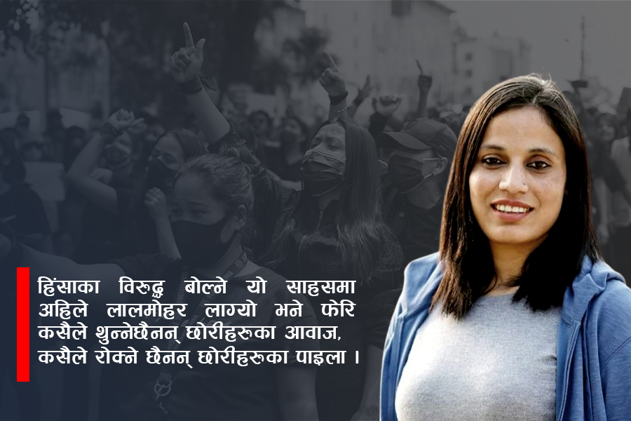 पढ्दा पढ्दैका विद्यार्थीहरू उठेका छन्, काम गर्दागर्दै महिलाहरू जुटेका छन् । यो बेला साथ तपाईंको चाहिएको हो, हाम्रो चाहिएको हो । किनभने, हिंसाविरुद्धको यो अभियानलाई अन्तिम बनाउनुपर्ने दायित्व सबैमा छ । अब पनि छोरीहरू हुर्किंदै गर्दा आमाहरू डरैडरले पिल्सनु नपरोस् । छोरीले वर्तमान बाँच्ने, भविष्य खोज्ने ठाउँ हिंसाभन्दा पर होस्, दुर्व्यवहारको गुञ्जायसै नहोस् ।