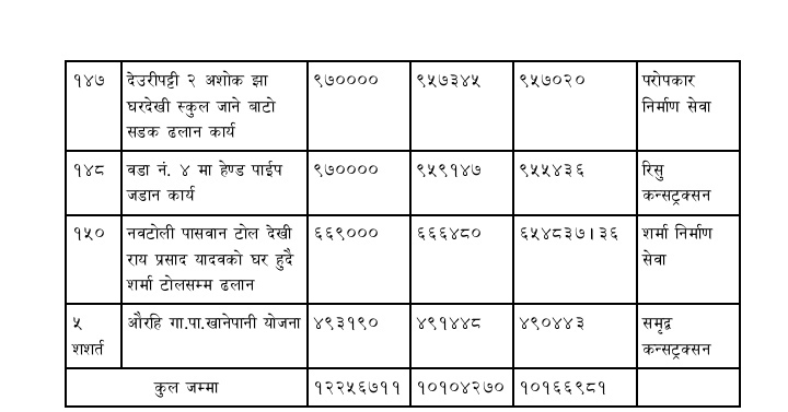 त्यसतै नवटोली पासवान टोल देखी राम प्रसादकोको घर हुदै शर्मा टोल सम्म सडक ढलानमा ६ लाख ६९ हजार लागत अनुमान रहेकोमा ६ लाख ६६ हजार ४ सय ८० रुपैया अर्थात ०.३७ प्रतिशत बिलोमा नै शर्मा निर्माण सेवालाई , वडा न.४ मा हेण्ड पम्प जडान कार्यका लागी ९ लाख ७० हजार लागत अनुमान रहेकोमा ९ लाख ५९ हजार १ सय ४७ रुपैया अर्थात १.११ प्रतिशत बिलोमा नै रिशु कन्स्ट्रक्सनलाई , दुउरीपट्टी अशोक झा घर देखी स्कुल जाने बाटो बाटोको लागी ९ लाख ७० हजार लागत अनुमान रहेकोमा ९ लाख ५७ हजार ३ सय ४५ रुपैया अर्थात १.३ प्रतिशत बिलोमा नै परोपकार निर्माण सेवालाई , गापा औरही ३ मा कृषि सडक निर्माणका लागी ९ लाख ७० हजार लागत अनुमान रहेकोमा ९ लाख ४९ हजार ८ सय ७८ रुपैया अर्थात २.०७ प्रतिशत बिलोमा नै माही एण्ड मोहित कन्स्ट्रक्सनलाई ठेक्का दिएको छ।