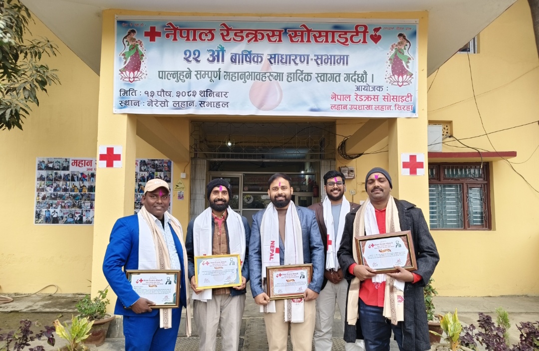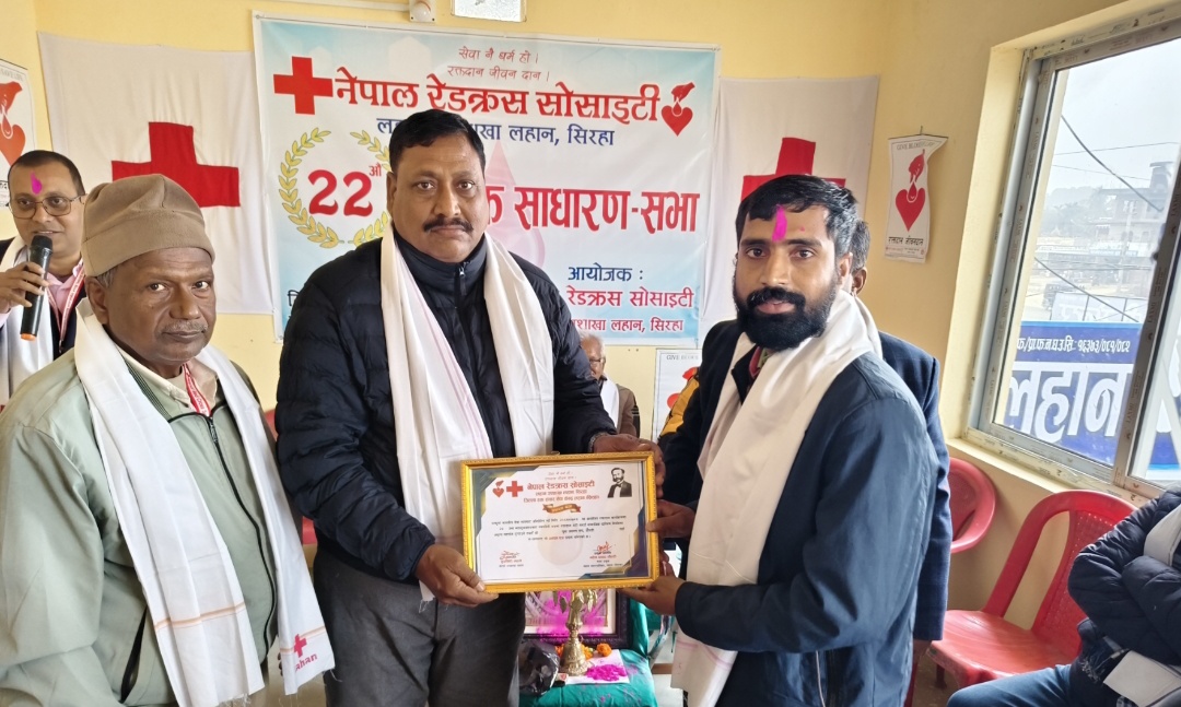 सिराहा : सिराहाको लहान स्थित नेपाल रेडक्रस सोसाइटी उपशाखा लहान ( रक्तदान सेवामा केन्द्र लहान ) सिराहाको २२ औ बार्षिक साधारणसभाको अवसरमा जनमत नेताद्वय पवन कुमार यादव र दिपेन्द्र कुमार यादव सम्मानित भएको छ।